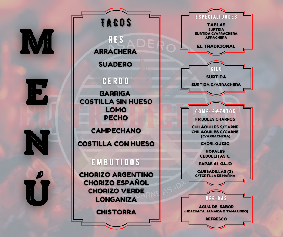 The menu at Asadero El Tradicional offers a rich variety of traditional Mexican flavors, with a focus on grilled meats and savory combinations. One of the standout dishes is the Barrigas de Cerdo, a flavorful option that is sure to satisfy any meat lover. For those craving a more classic taco experience, the Tacos de Costilla Sin Hueso provides tender, bone-free rib meat, perfectly seasoned for a comforting bite. The Taco de Asada Y Chorizo Argentino brings a unique twist with a blend of perfectly grilled beef and Argentine chorizo, delivering a deliciously smoky flavor. A must-try for cheese lovers is the Choriqueso, a rich and indulgent dish featuring chorizo combined with melted cheese, creating a mouthwatering combination that pairs wonderfully with tortillas. The menu offers these hearty options alongside other tempting choices, making it a great destination for anyone seeking authentic, satisfying Mexican cuisine.